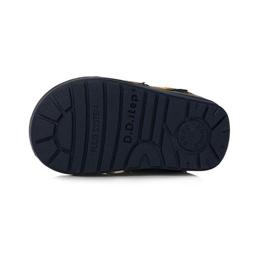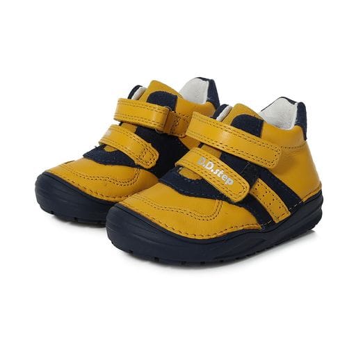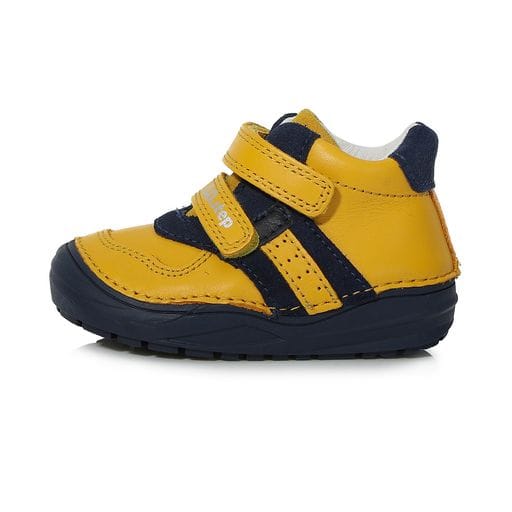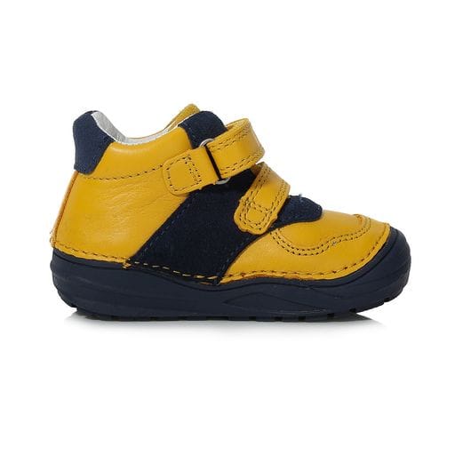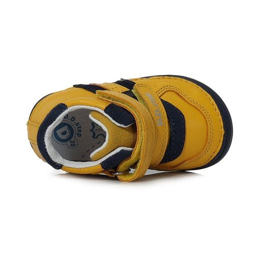 DD Step kisfiú „első lépés” bőrcipő okker sárga színben. Megerősített kéreggel és orrvédelemmel ellátva. Két tépőzárral szabályozható.