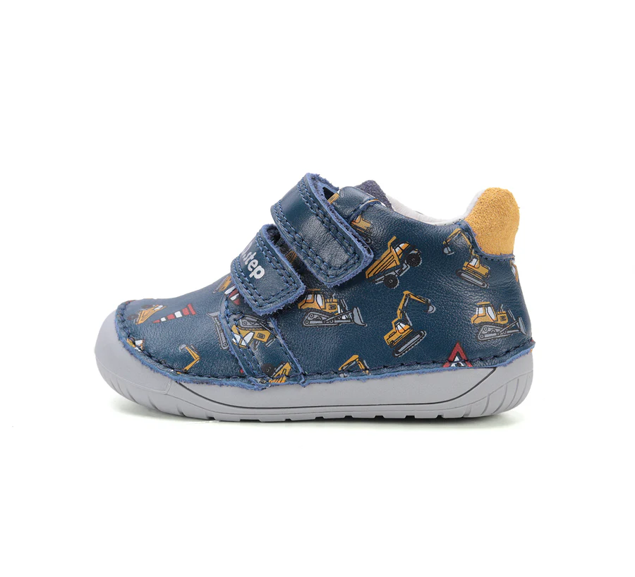 DD Step fiú mezítlábas ún. barefoot bőrcipő. Királykék színben, munkagépes mintával. A cipő zéró drop talbetéttel készült, amely kivehető. Hajlékony és maximális talajérzékelést biztosít a gyermeked számára. Megerősített orr résszel lett ellátva.