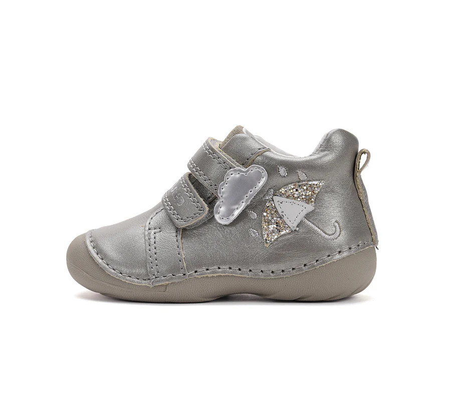 DD Step első lépés bőrcipő, sötét ezüst színben, oldalán esernyő mintával. Megerősített kéreggel és orrvédelemmel ellátva. Hajlékony, rezgéscsillapító talppal.