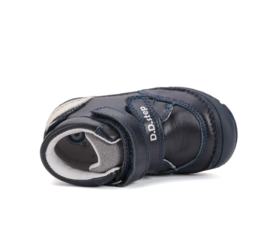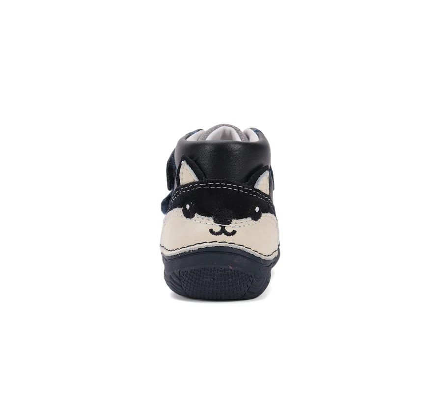 DD Step fiú első lépés bőrcipő. Királykék színben , mosómedve mintával. Megerősített kéreggel és orrvédelemmel ellátva. Két tépőzárral szabályozható. Biztos tartás a kis lábaknak.