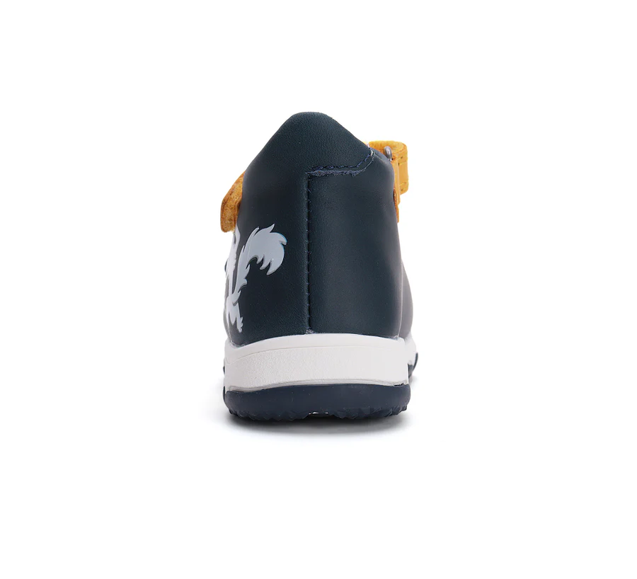 DD Step fiú bőrszandál, királykék színben, oldalán farkas mintával. A minta napfényre színesedő, ún. sun reactive. Kéreg merevített, két csattal és egy tépőzárral szabályozható.