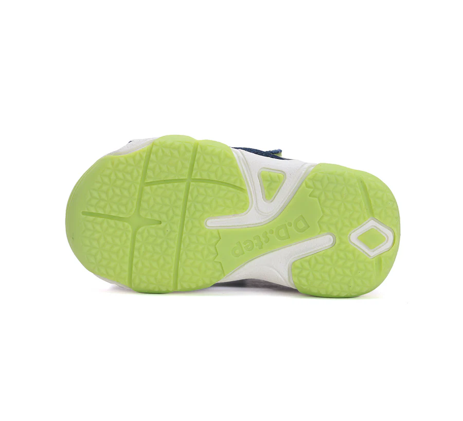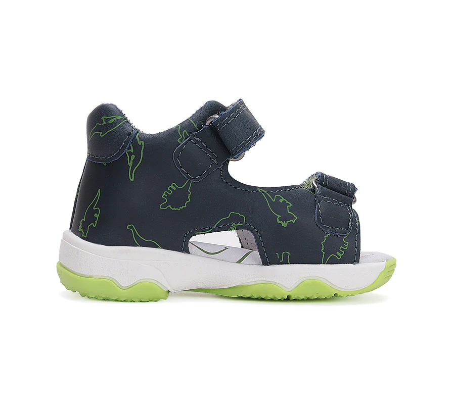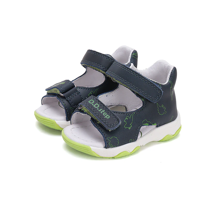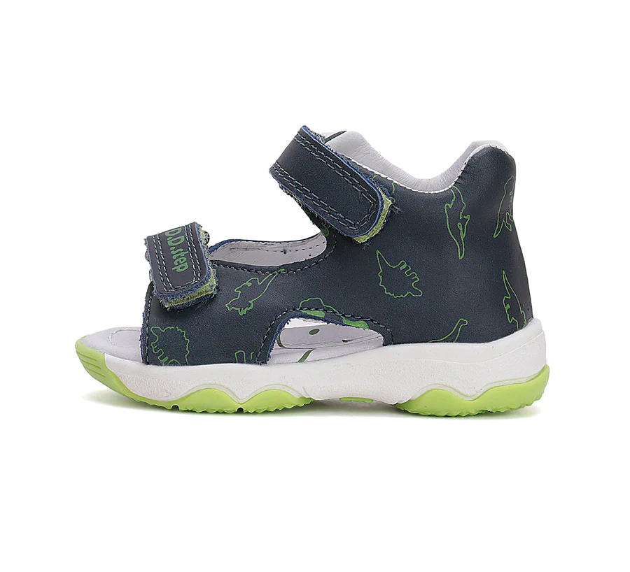 DD Step fiú bőrszandál. Királykék színben, dínó mintával. Megerősített kéreggel ellátva. A szandál két tépőzárral szabályozható.