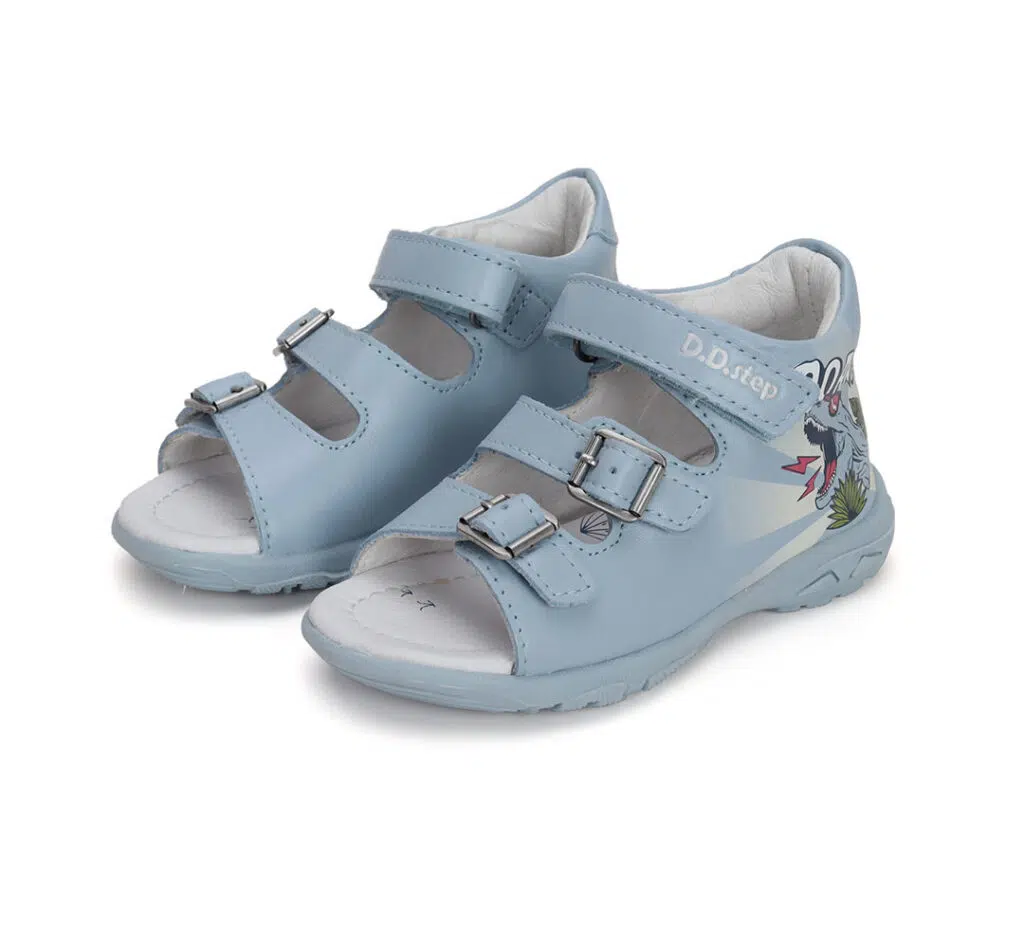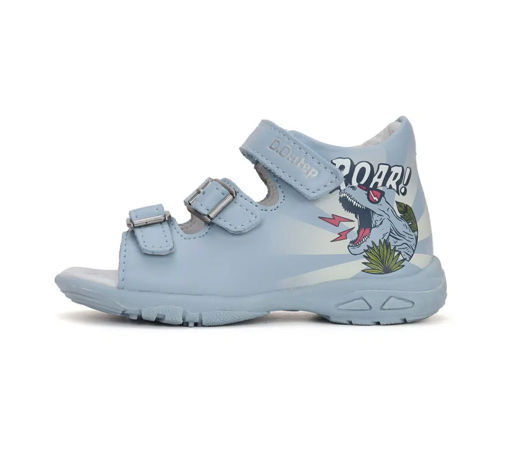DD Step fiú szandál, oldalán dínó mintával. Megerősített kéreggel ellátva a megfelelő bokatartásért. Két csattal és egy tépőzárral szabályozható. UV reaktív, napfény hatására kiszínesedik az oldalán található minta.