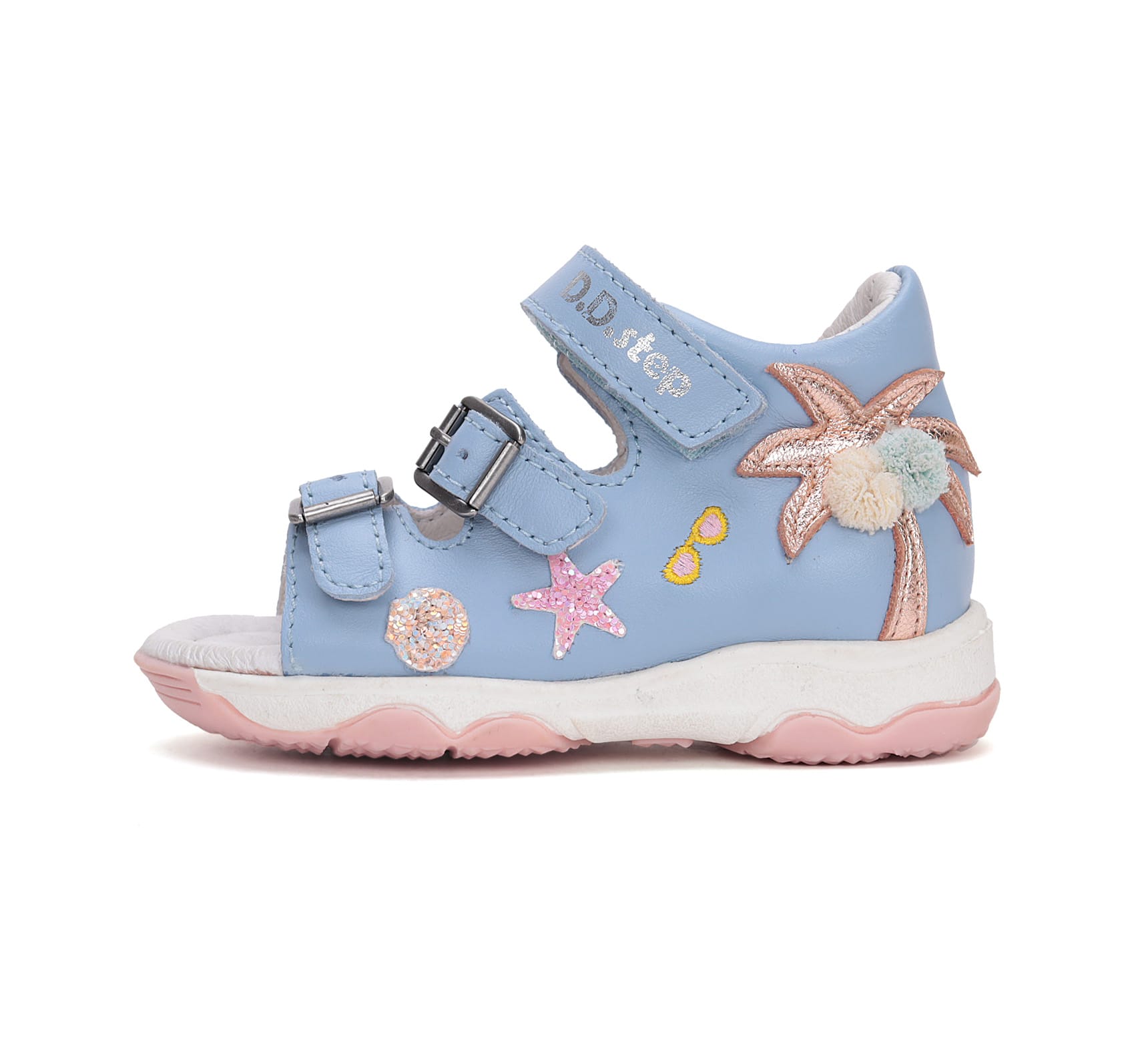 DD Step lány bőr szandál! Ez a világoskék szandál nyári hangulatú pálmafa mintával és megerősített kéreggel biztosítja a megfelelő bokatartást, így gyermeked lábai biztonságban és kényelemben lesznek. A két csatnak és a praktikus tépőzárnak köszönhetően a szandál könnyen igazítható a kis lábakhoz.