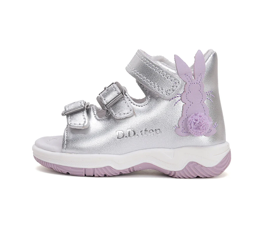DD Step lány bőrszandál , ezüst színben, oldalán nyuszi mintával. Megerősített zárt kéreggel ellátva. A szabályozható tépőzáras és csattos kialakításnak köszönhetően könnyedén igazítható a gyermek lábára.
