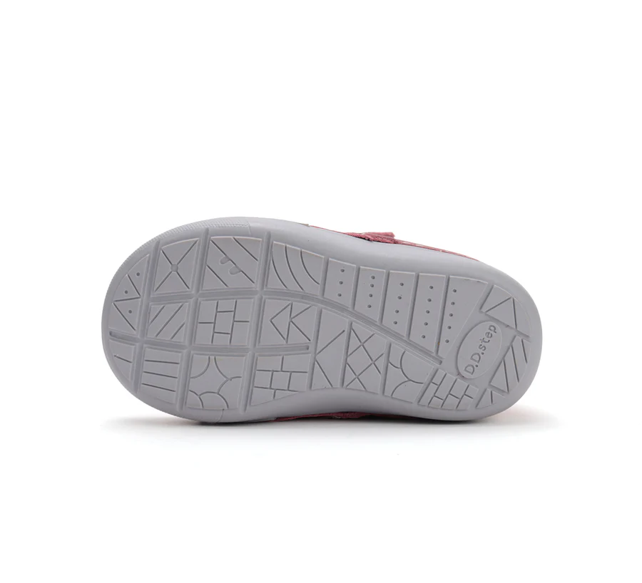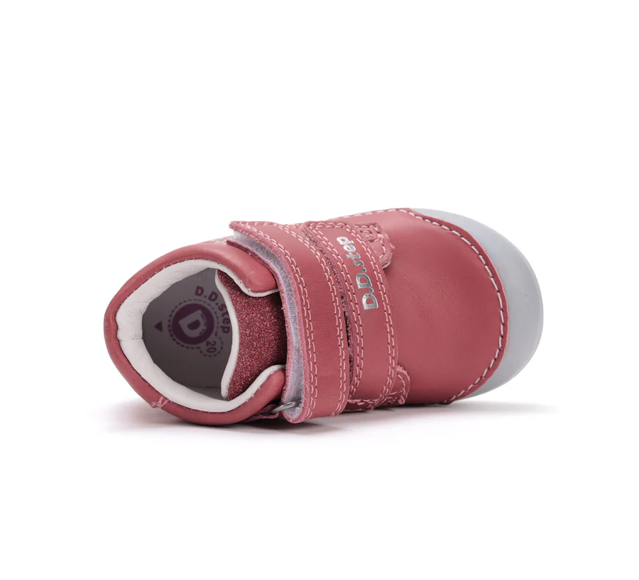 DD Step lány első lépés bőrcipő. Rózsaszín színben, oldalán ezüst virág mintával. Megerősített kéreggel és orrvédelemmel ellátva.