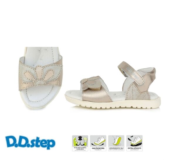 DD Step pezsgő színű bőrszandál, virág díszítéssel.