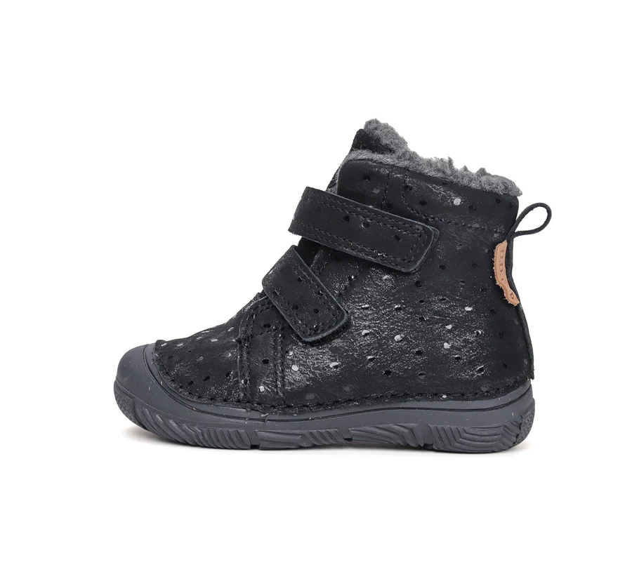 DD Step bélelt kislány bakancs. Fekete színben, oldalán csillámos díszítéssel. Kívül bőr, belül bunda béléssel.Megerősített kéreggel és orrvédelemmel ellátva.