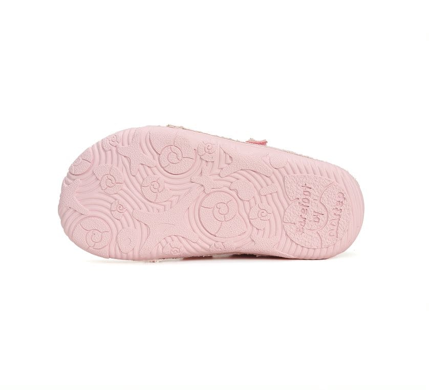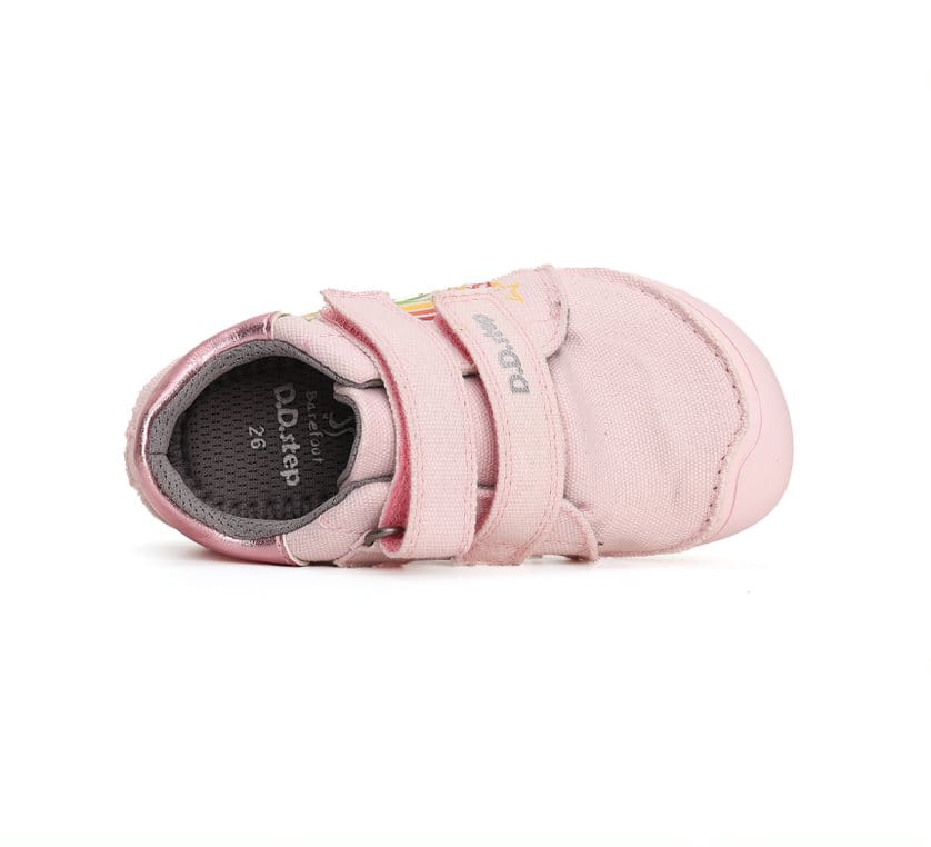 DD Step Barefoot (mezítlábas) rózsaszín vászoncipő, oldalán szivárvány mintával. Kiváló alternatíva játszós cipőnek.  A mezítlábas cipőben megfelelően erősödik a gyermek lába.