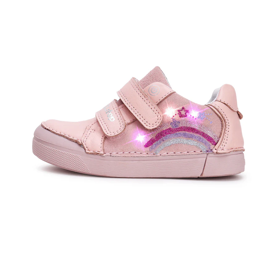 DD Step LED -es bőrcipő, rózsaszín színben, oldalán szivárvány mintával.