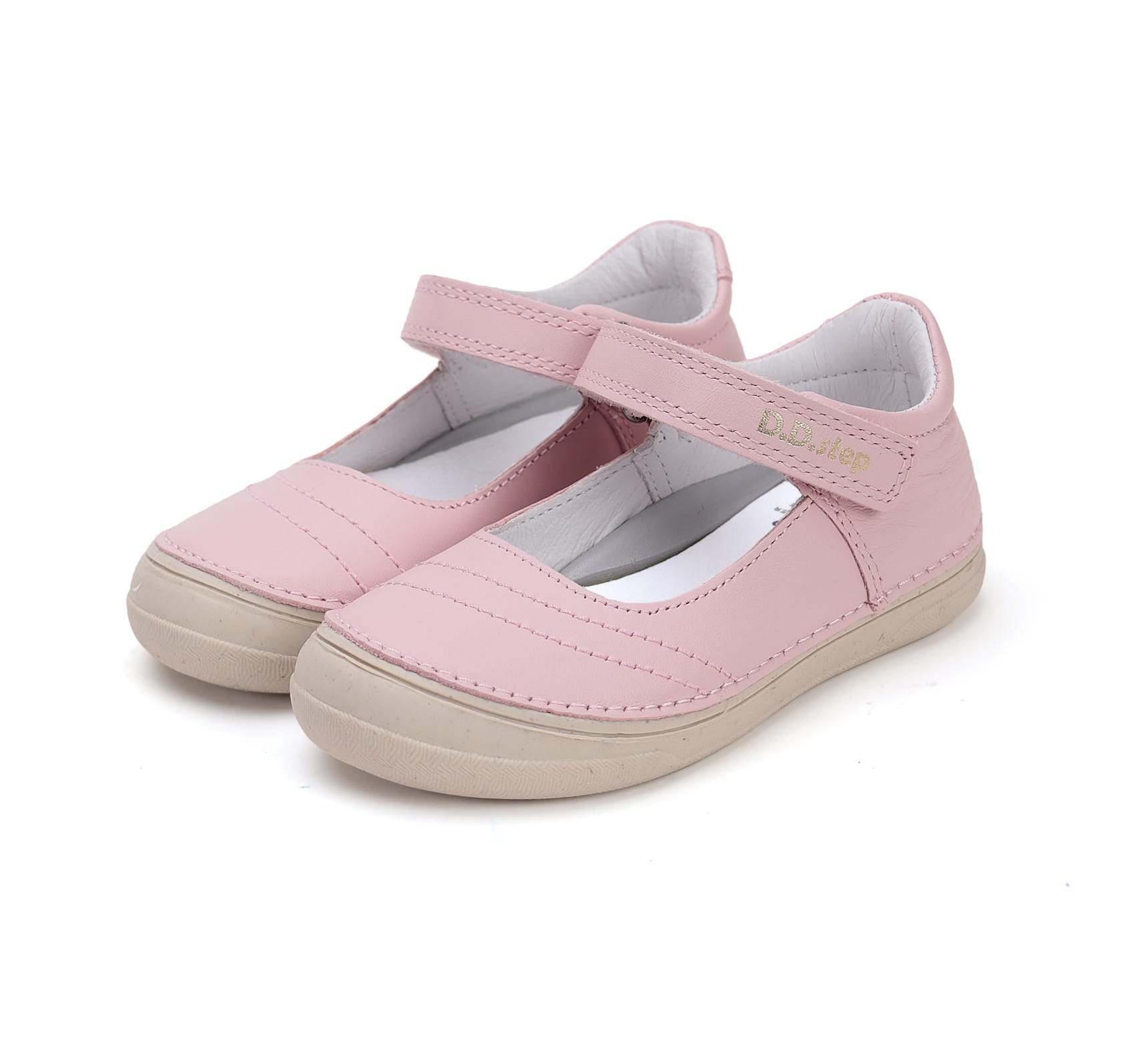 DD Step nyitott lány bőrcipő. Balerina fazon, rózsaszín színben. Talpa természetes gumiból és cukornádból készült. Egy tépőzárral szabályozható.