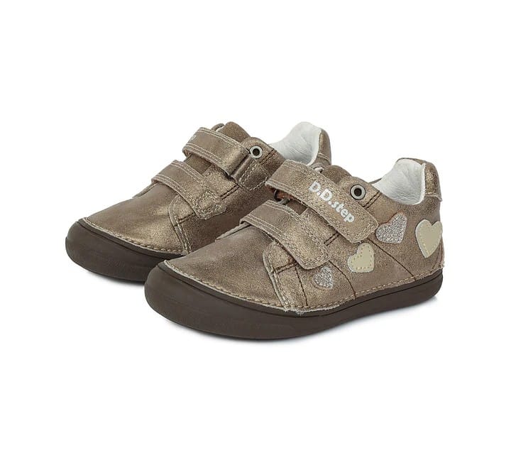 DD Step pezsgő színű bőrcipő, oldalán szív mintákkal. Két tépőzárral szabályozható.
