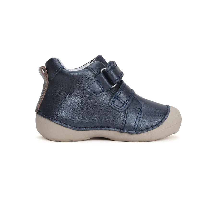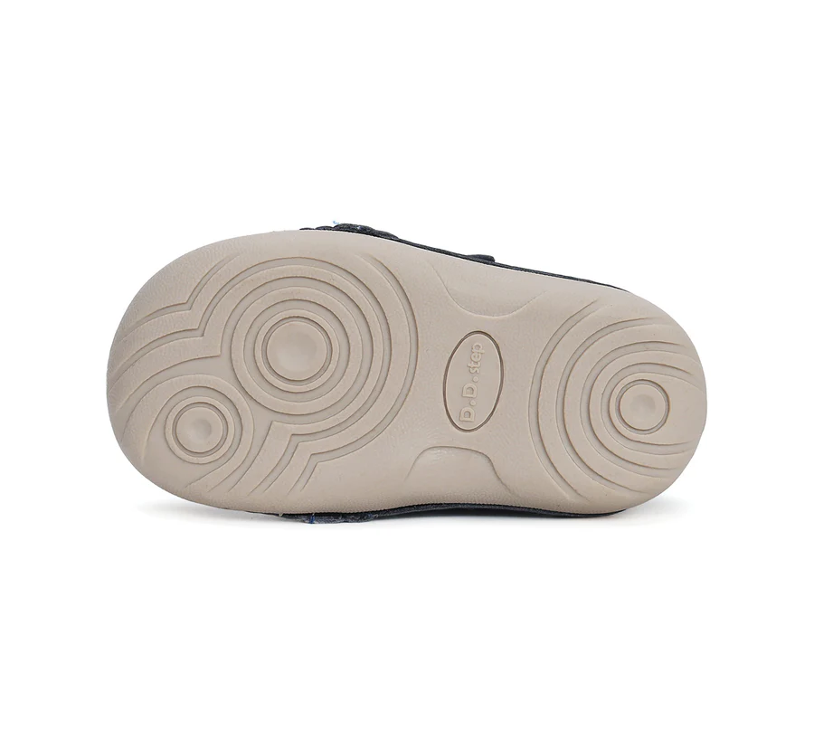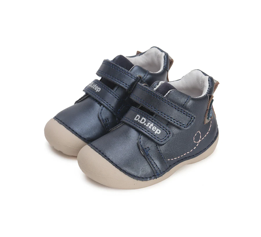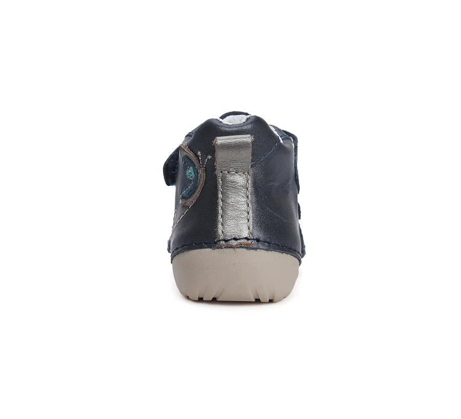 DD Step „első lépés” bőrcipő, fekete színben. Oldalán pillangó mintával. Megerősített kéreggel és orrvédelemmel ellátva. Két tépőzárral szabályozható.