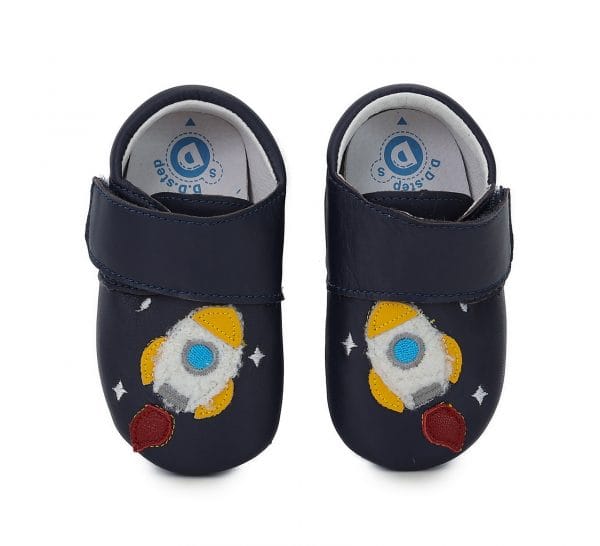 DD Step puhatalpú bőr kocsicipő kék színben, rakéta díszítéssel. Ideális választás babakocsiba, szobacipőnek. Tépőzárral szabályozható. Talpa csúszásgátló gumival ellátott.