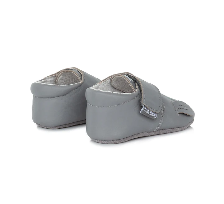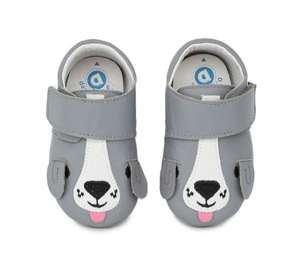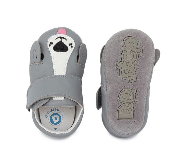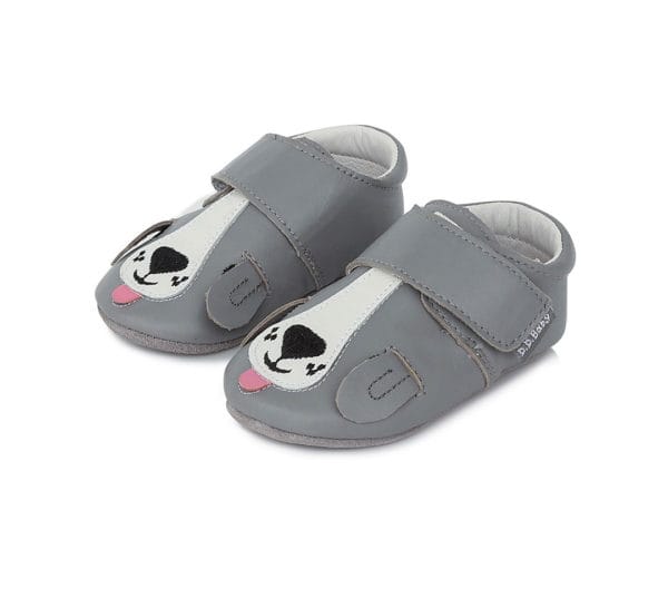 DD Step puhatalpú bőr kocsicipő szürke színben, kutyás díszítéssel. Ideális választás babakocsiba, szobacipőnek. Tépőzárral szabályozható. Talpa csúszásgátló gumival ellátott.