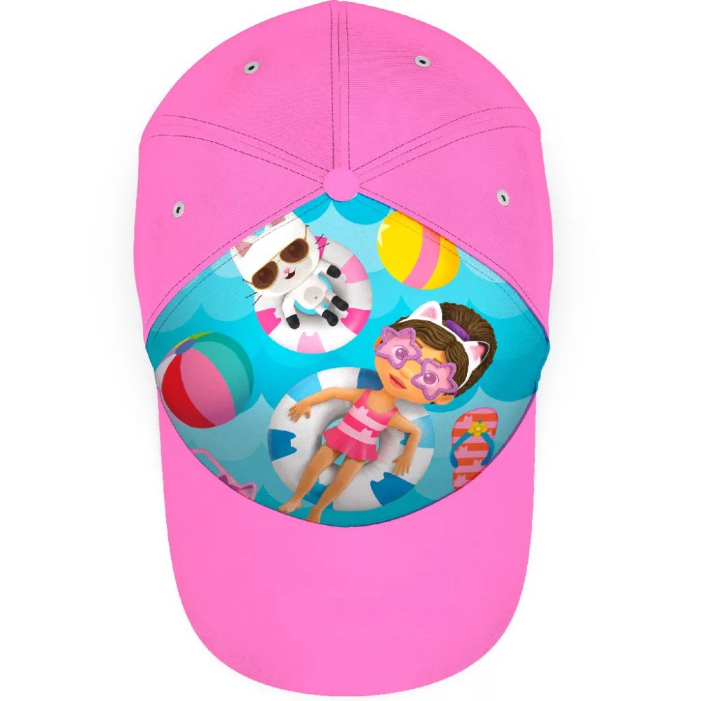 A nyári napok elengedhetetlen kelléke egy vidám sapka, mely véd a tűző nap ellen. Gabi kis barátai mosolyognak ezen a rózsaszín színű sapkán.