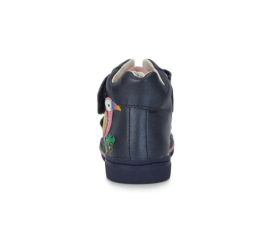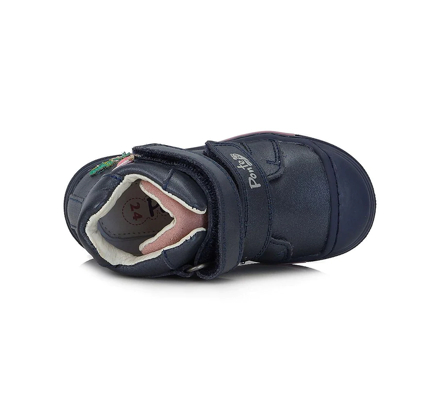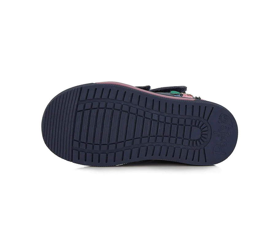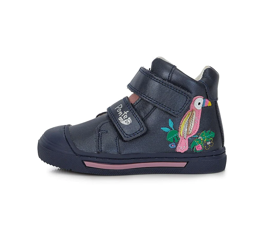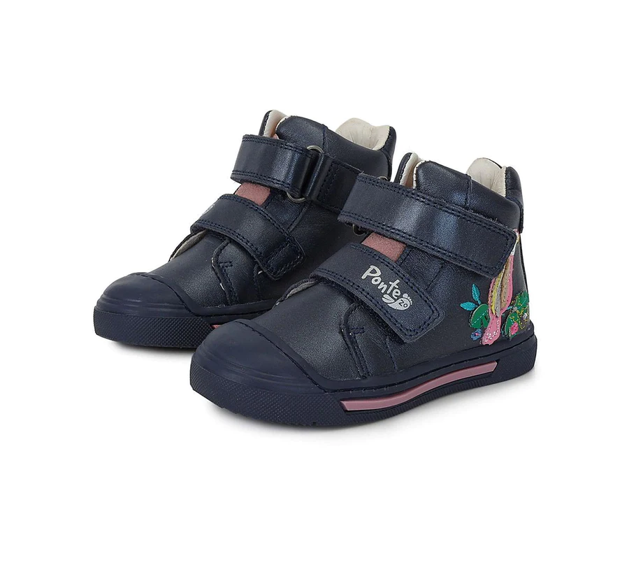 A Ponte20 szupinált lány bőrcipő sötétkék színben, vidám madár mintával játékos és stabil választás a mindennapokra. A szupinált sarokkialakítás segíti a boka megfelelő tartását, támogatva a helyes lábállást.