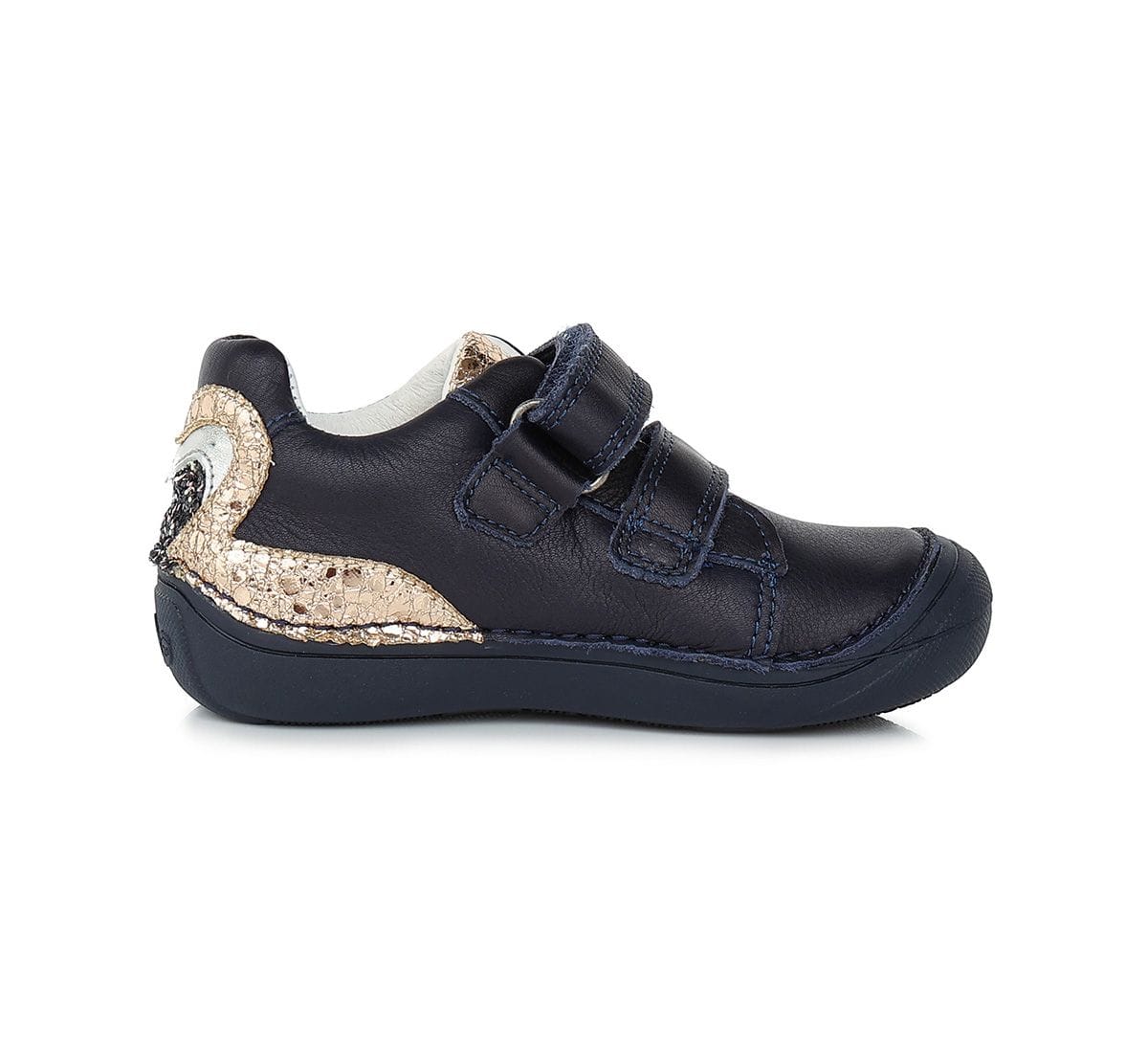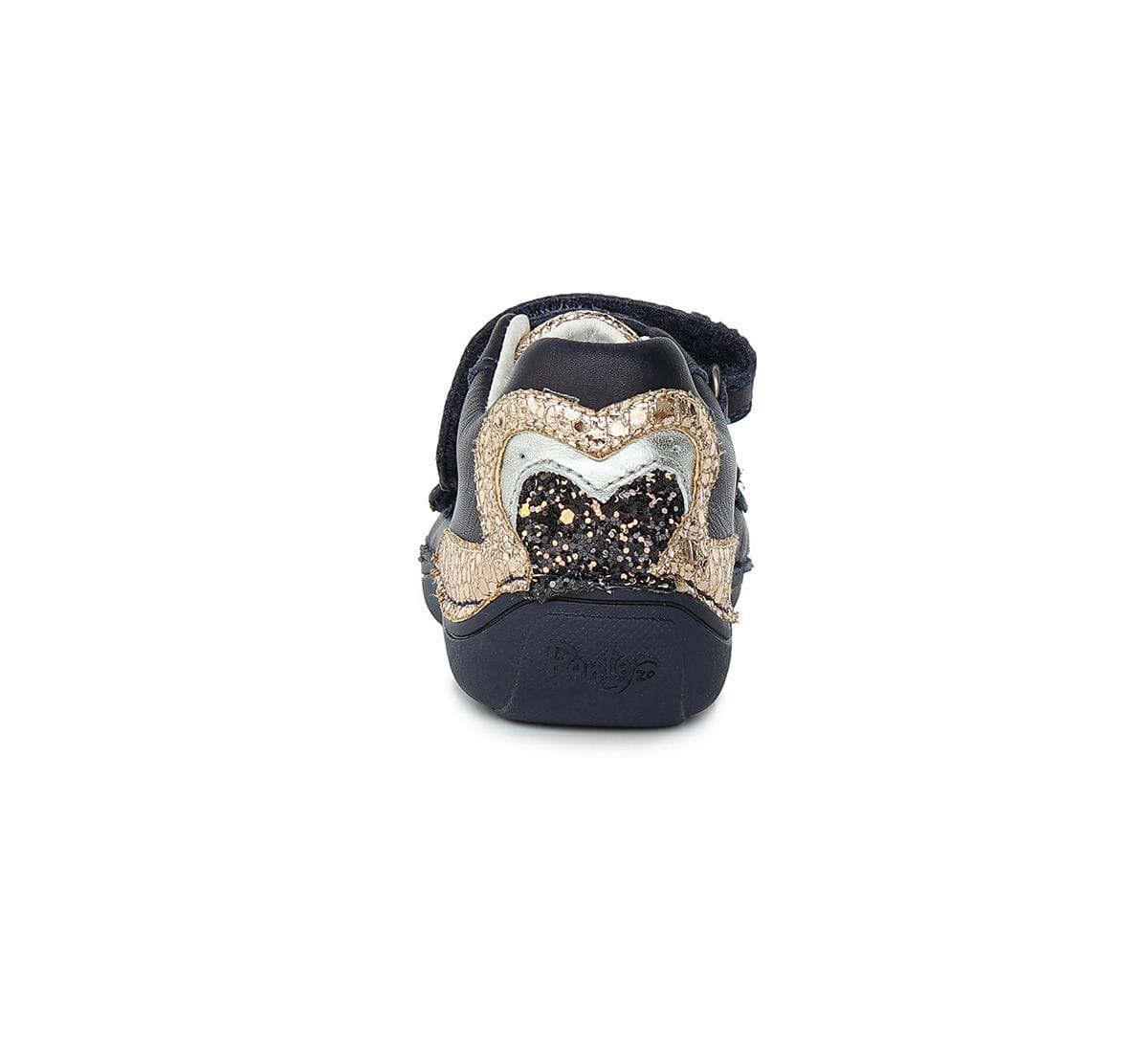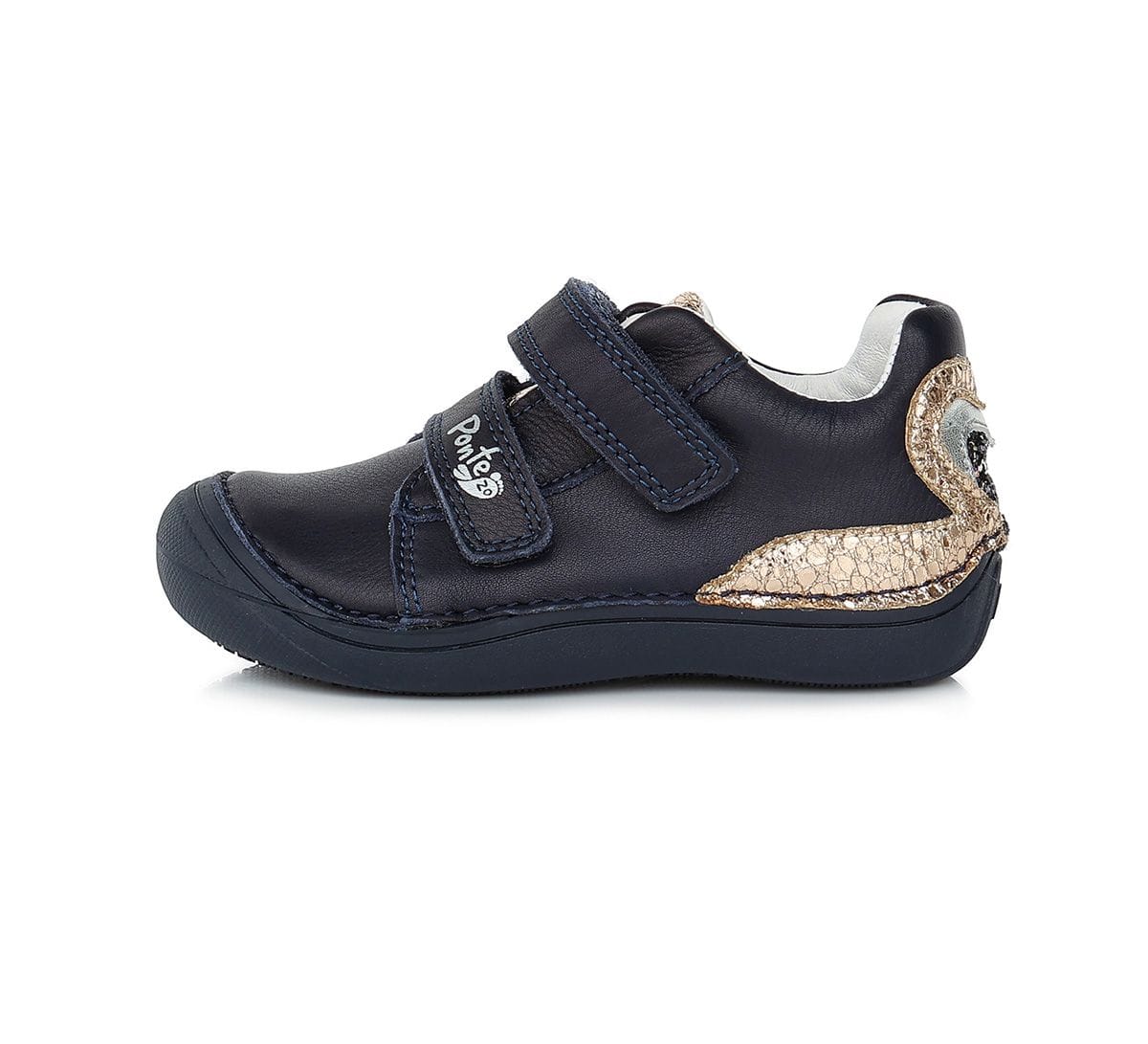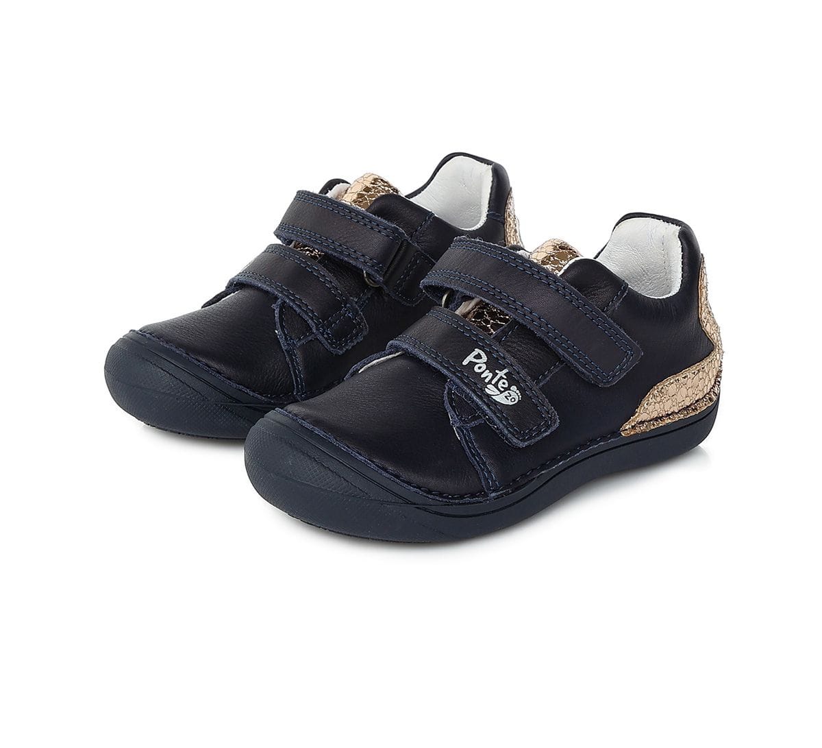 A Ponte20 szupinált lány bőrcipő sötétkék színben, arany sarokdísszel elegáns és modern megjelenést ad. A szupinált sarokkialakítás segíti a boka megfelelő tartását, támogatva a helyes lábállást.