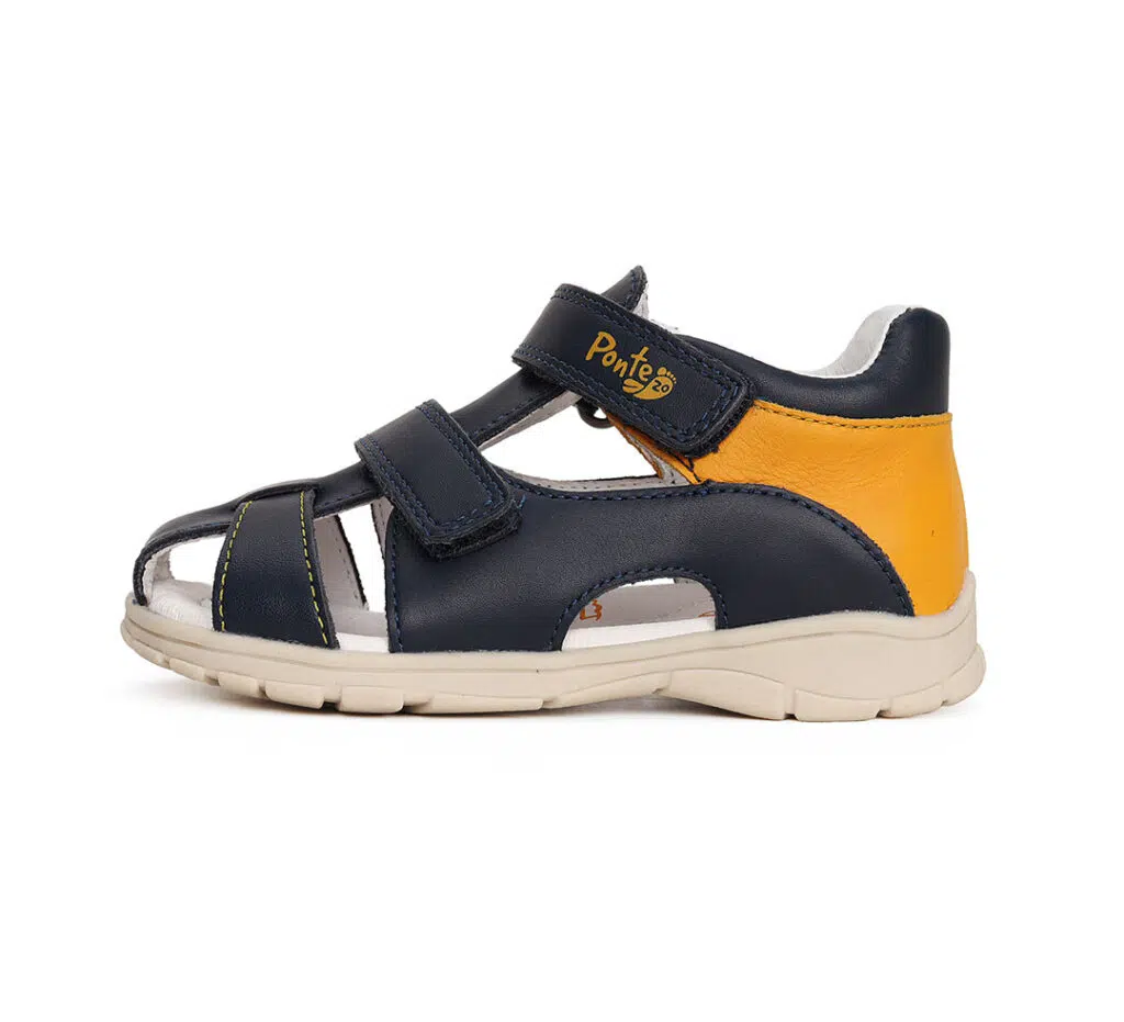 A Ponte20 szupinált, zárt orrú és zárt kérgű bőrszandál fekete–sárga színben készült, stabil tartást és kényelmes viseletet biztosít a fejlődő lábak számára. A szupinált kialakítás támogatja a helyes lábtartást, a megerősített kéreg pedig megfelelő bokastabilitást nyújt. Két tépőzáras pántjának köszönhetően könnyen és pontosan a gyermek lábára állítható. Valódi bőr felsőrésszel és tartós, csúszásgátló talppal ideális választás mindennapi használatra.