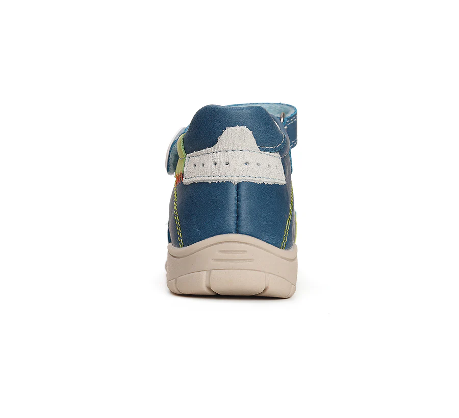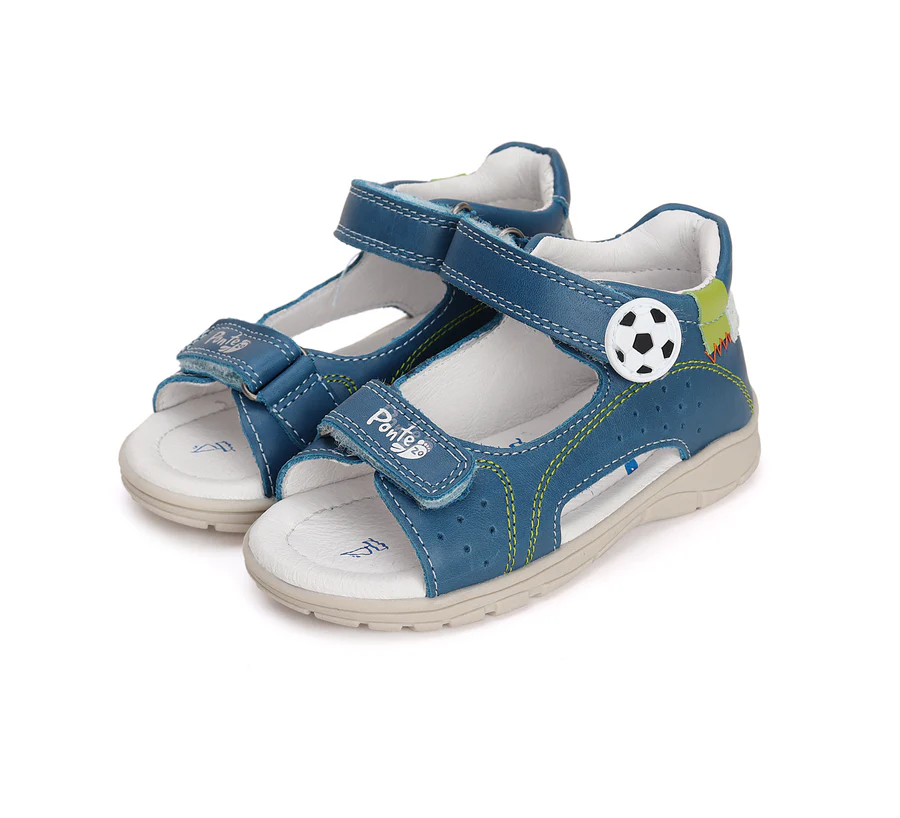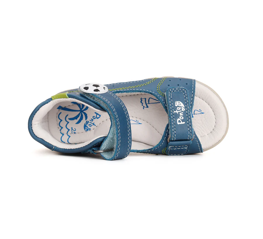 Ponte20 szupinált bőrszandál kék színben, focilabda mintával. Megerősített kéreggel a megfelelő bokatartásért. Nyitott orrú, két tépőzárral szabályozható szandál.