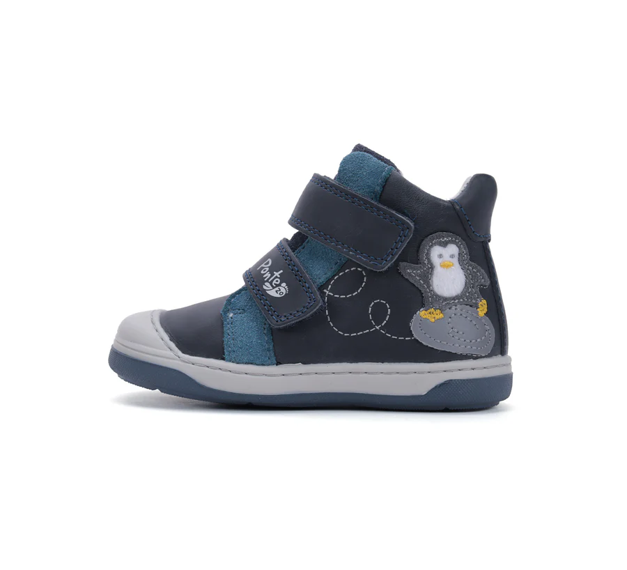 Ponte20 szupinált fiú bőrcipő, királykék színben, oldalán pingvin mintával. Reflektíve – fényvisszaverő díszítéssel. Megerősített kéreggel és orrvédelemmel ellátva. Elsősorban normál/széles lábfejre ajánlott.