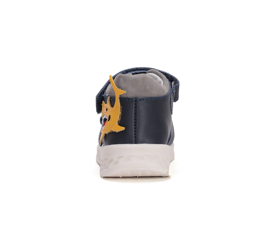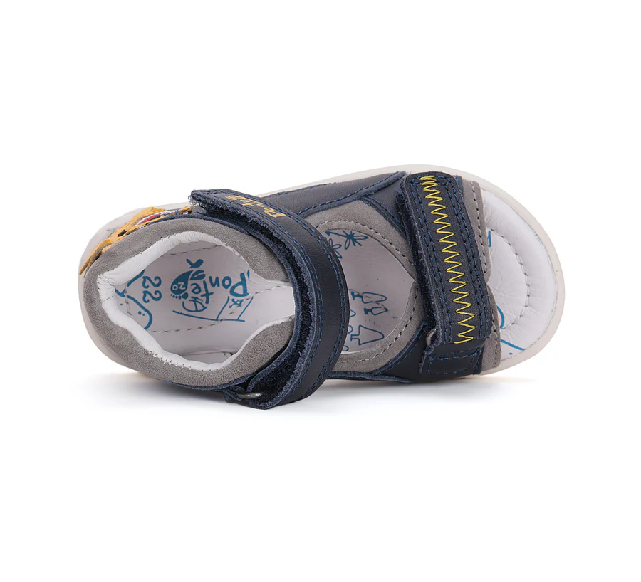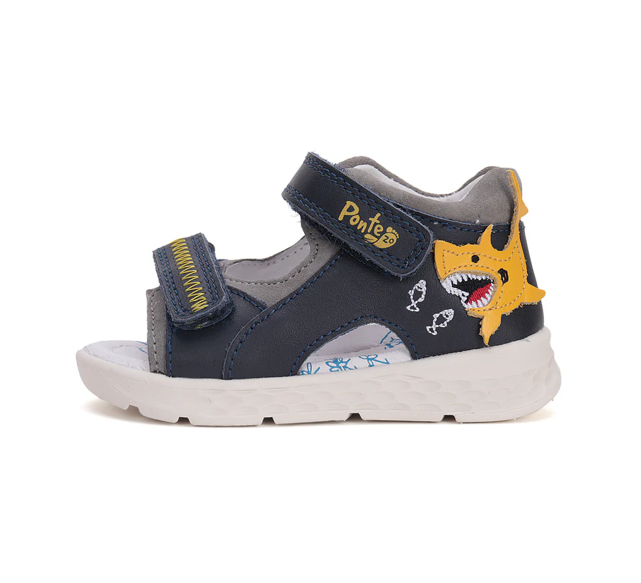 Ponte20 szupinált fiú bőrszandál, királykék színben, oldalán cápa mintával. Megerősített kéreggel ellátva. A szabályozható tépőzáras kialakításnak köszönhetően könnyedén igazítható a gyermek lábára.