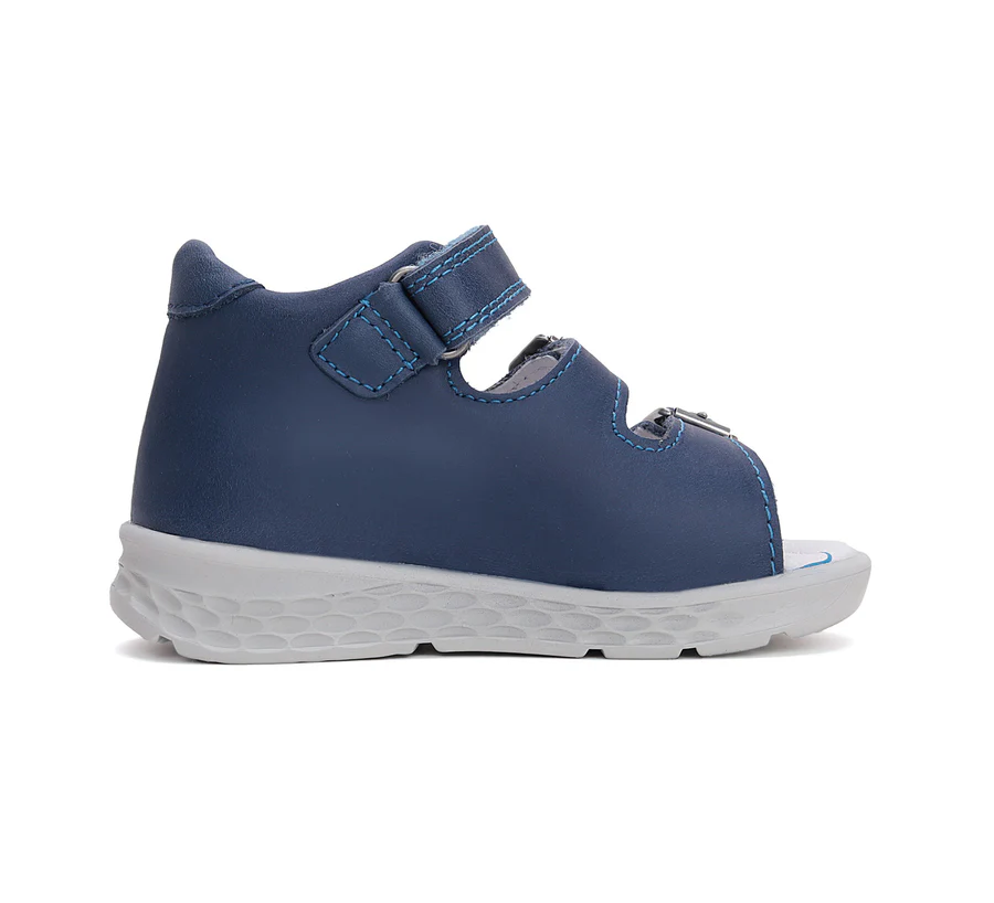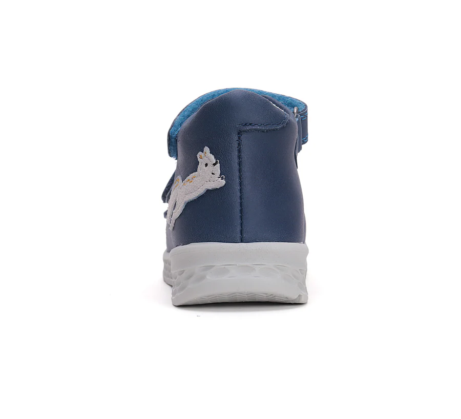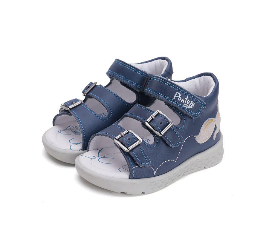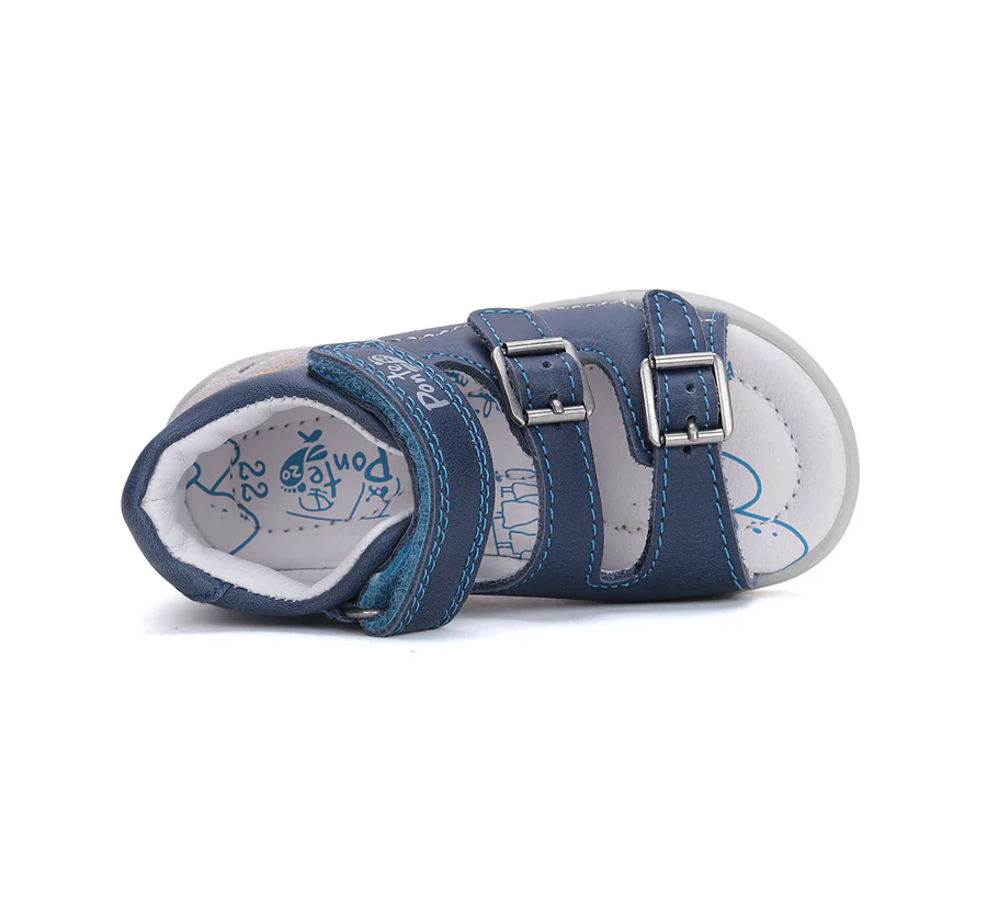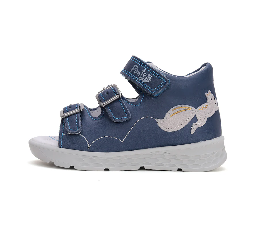 Ponte20 szupinált fiú bőrszandál. Kék színben, mókus díszítéssel. Két csattal és egy tépőzárral szabályozható. Hajlékony, könnyű talppal készült.