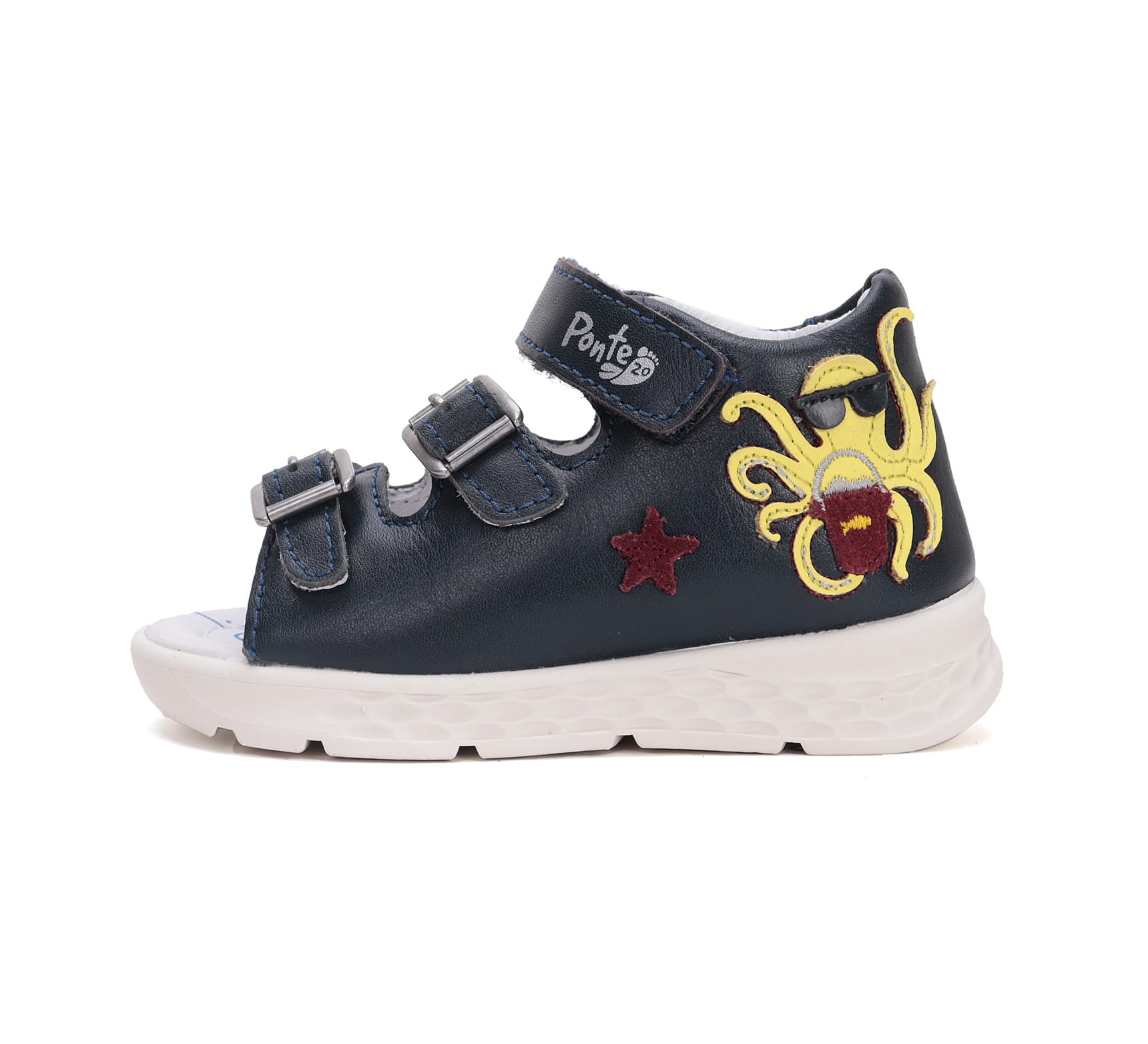 Ponte20 szupinált bőrszandál kényelem és biztonság gyermeked számára! Ez a sötétkék, polip mintás szandál nemcsak stílusos, de a megerősített kéregnek köszönhetően kiválóan tartja a bokát is, így gondoskodik a megfelelő lábtartásról. A két csattal és tépőzárral könnyen és pontosan igazítható a kis lábakra. Válaszd a minőséget és a divatot, válaszd a Ponte20-t