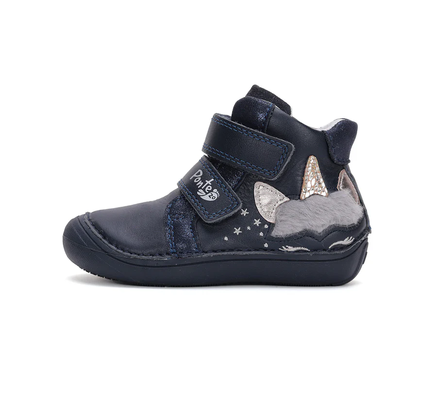 A sötétkék Ponte20 szupinált lány cipő unikornis mintával igazán különleges megjelenést ad. A szupinált sarokkialakítás segíti a helyes lábtartást.