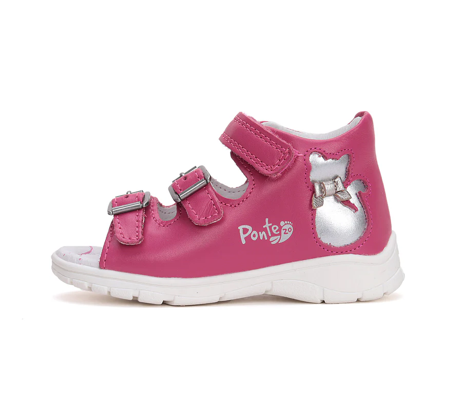 A Ponte20 szupinált bőrszandál stílusos és rendkívül kényelmes is! A rózsaszín szín és a cica minta vidámmá varázsolja a kicsik lábát. Az állítható két csat és tépőzár segítségével könnyen fel- és levehető, így tökéletes választás a nyári kalandokhoz!