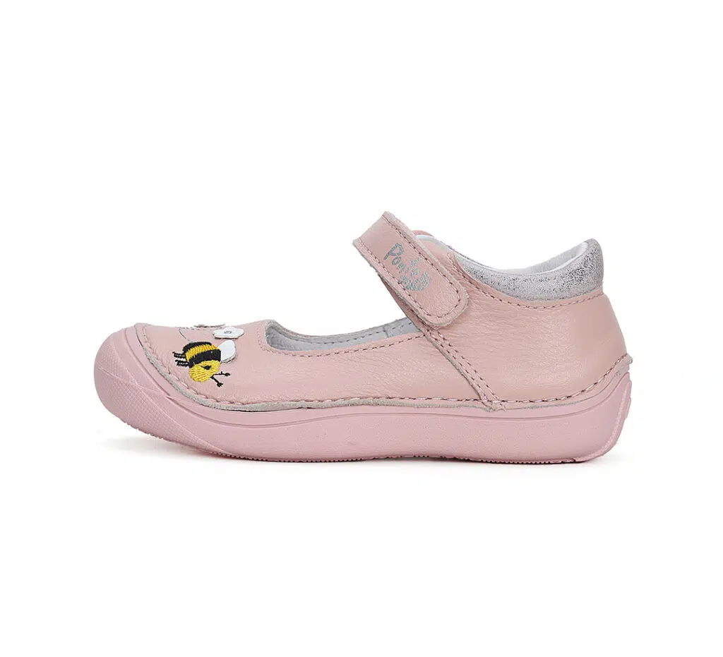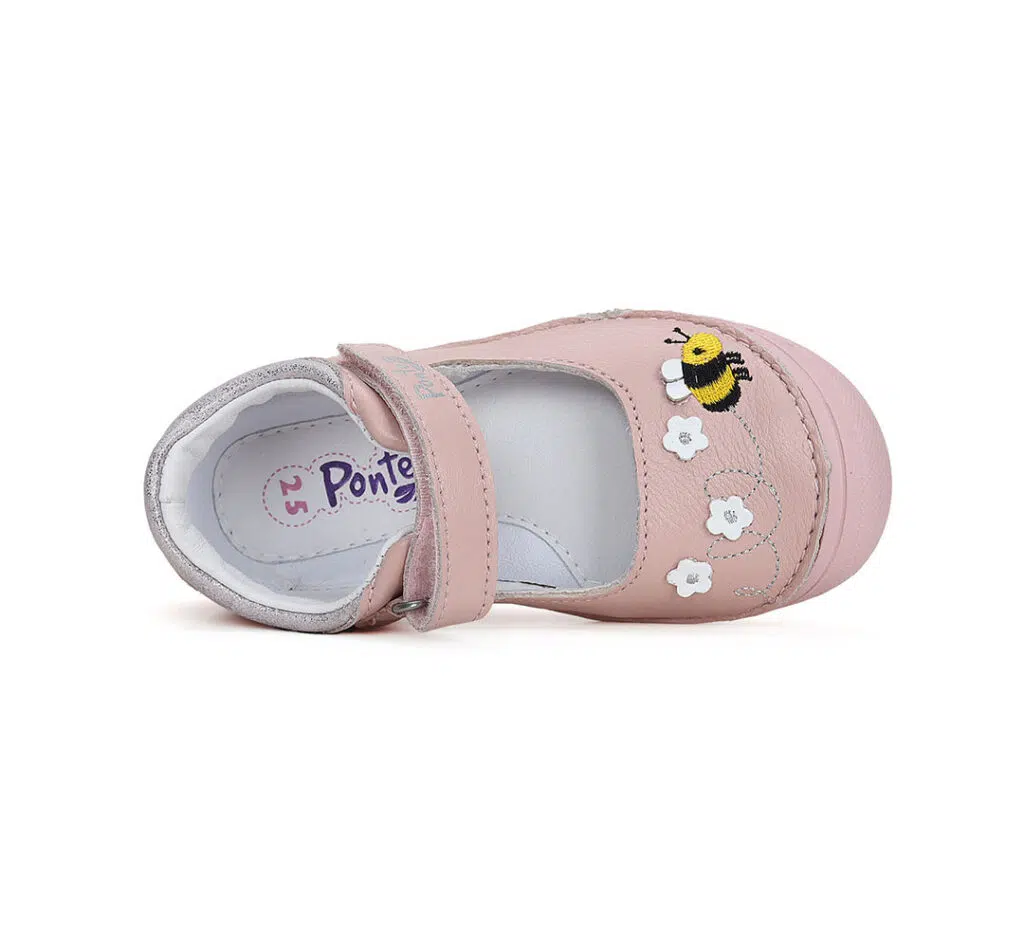 Ponte20 szupinált kislány bőr félcipő. Rózsaszín színben, méhecske mintával. Megerősített kéreggel és orrvédelemmel ellátva. Egy tépőzárral szabályozható.
