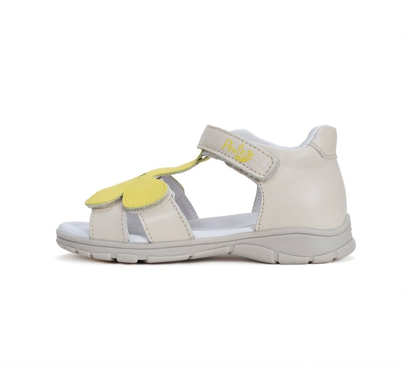Ponte20 supinált lány bőrszandál. Krém színben, zöld virág mintával. Megerősített kéreggel ellátva, két tépőzárral szabályozható.