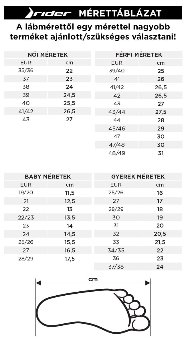 | RIDER mérettáblázat | 30 (19cm), 31 (20cm), 32 (20,5cm), 33 (21,5cm), 34/35 (22cm), 36 (23cm), 37/38 (24cm) |