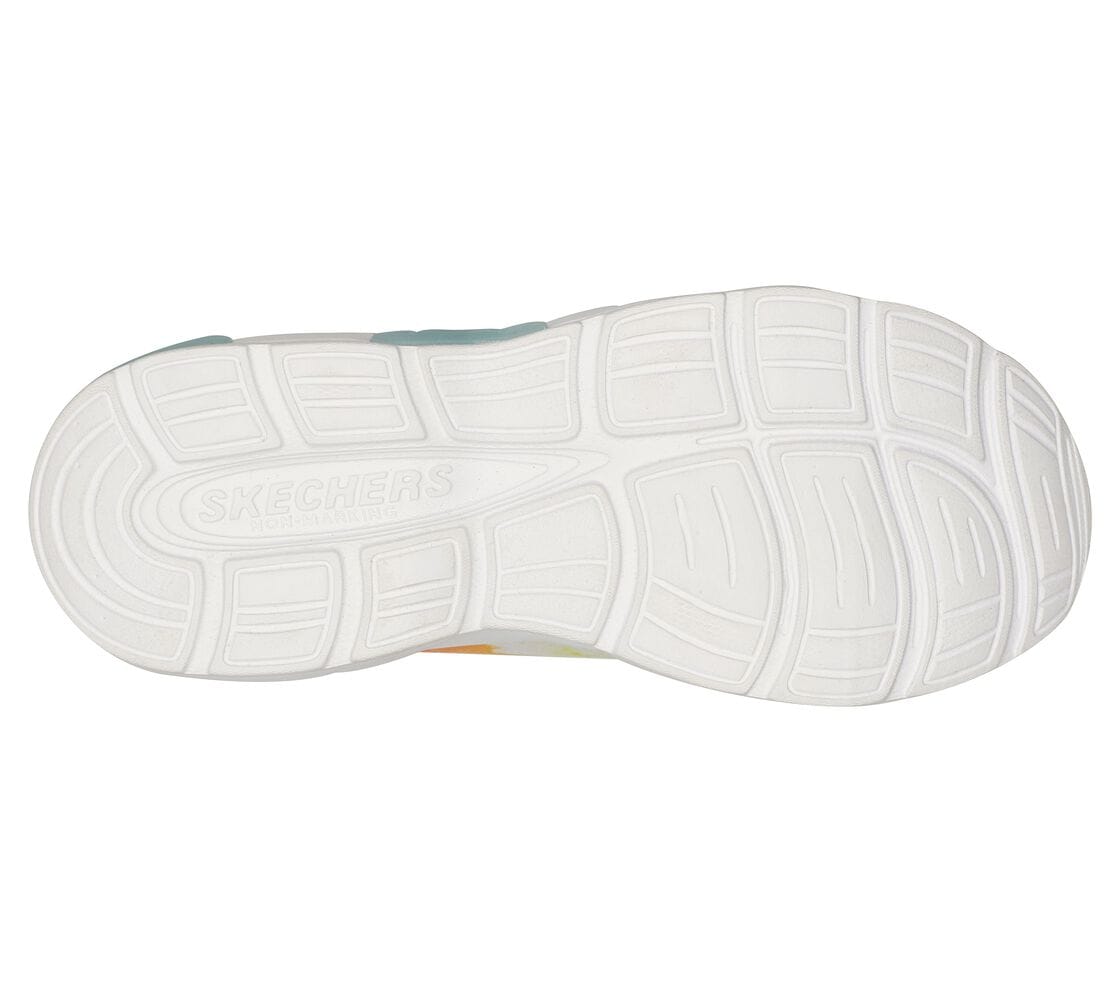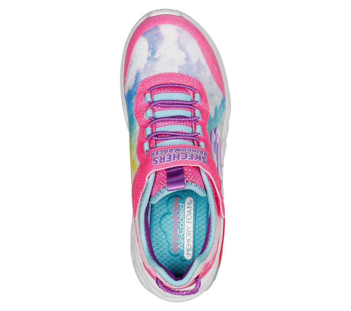 A Skechers lány világító talpú sportcipő kiváló választás gyerekek számára. Egész napos kényelmet biztosítanak a párnázott talpnak köszönhetően. A cipő textil és szintetikus anyagokból készült, szivárványos-felhős mintájú formázott, világítós középtalppal készült. A Skechers gyerekcipők magas minőséget képviselnek.