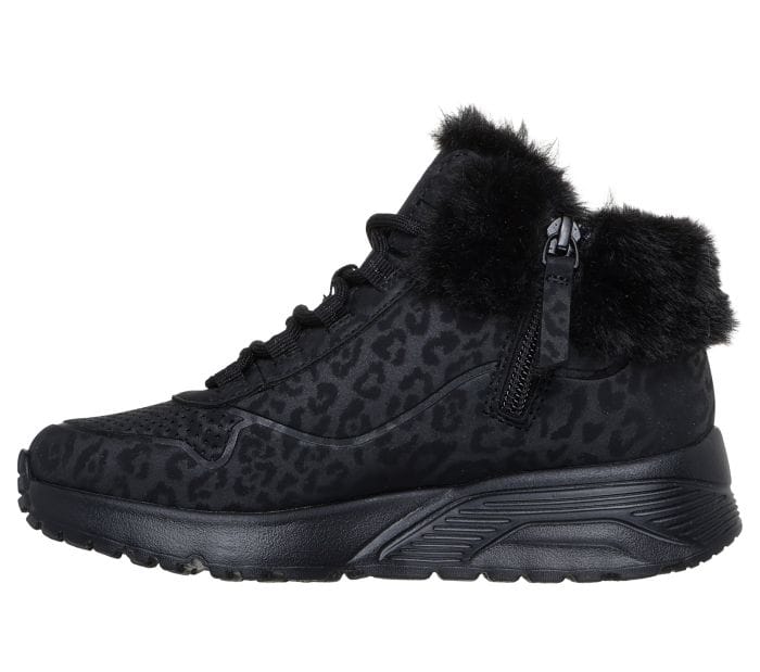 SKECHERS Uno Lite -Cozy Leopard sportosan elegáns leopárd mintás cipő. Fekete színben, leopárd mintával és műszőrme szegéllyel készült. Air-Cooled Memory Foam® talpbetéttel egész napos kényelmes viselet. Cipzárral záródó.