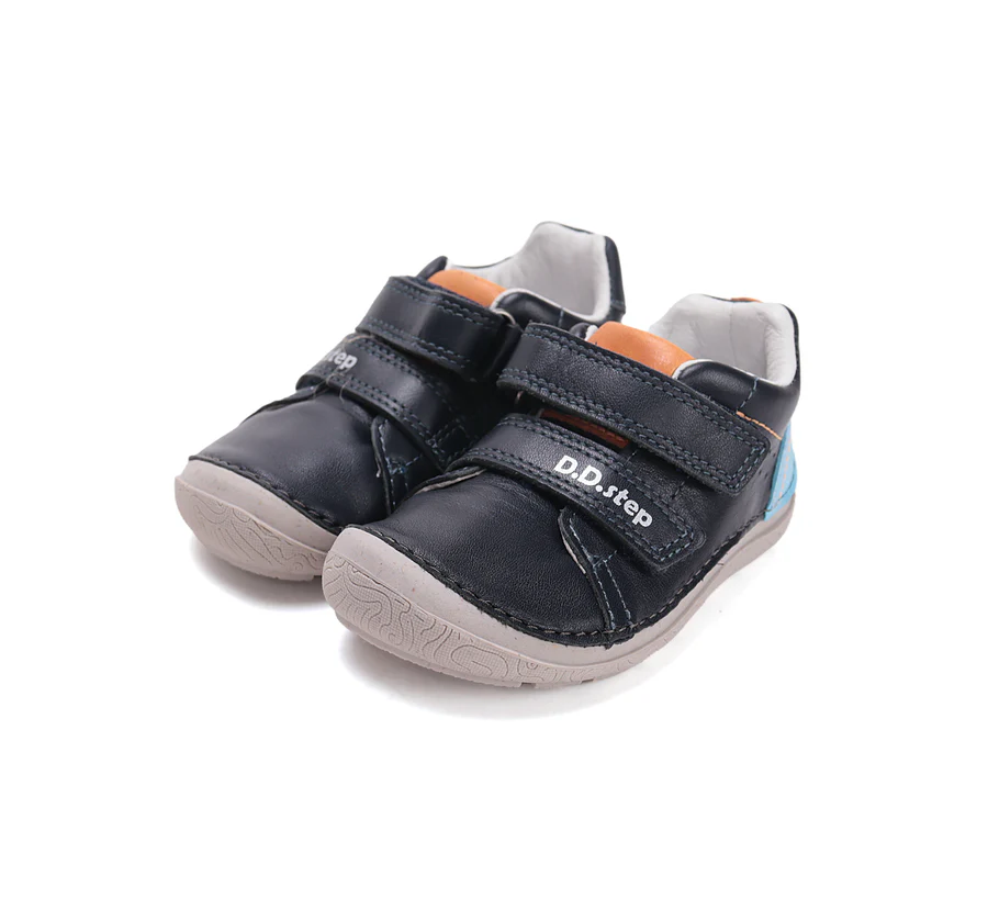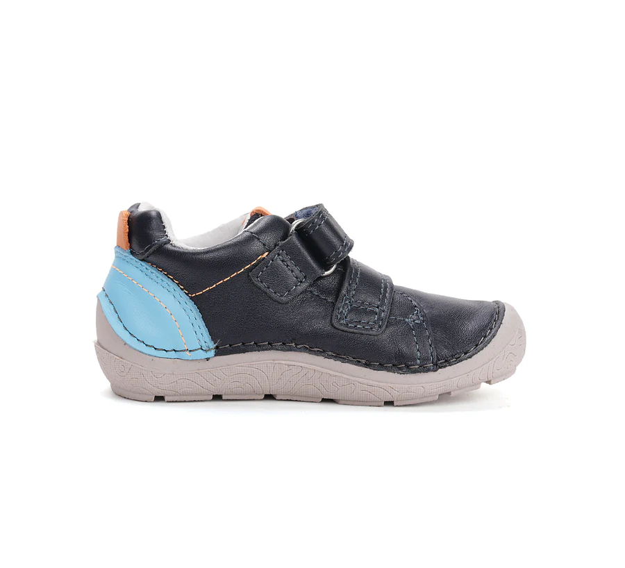 A DD Step barefoot fiú bőrcipő fekete–kék színben a természetes mozgást és a kényelmet ötvözi a mindennapokban.