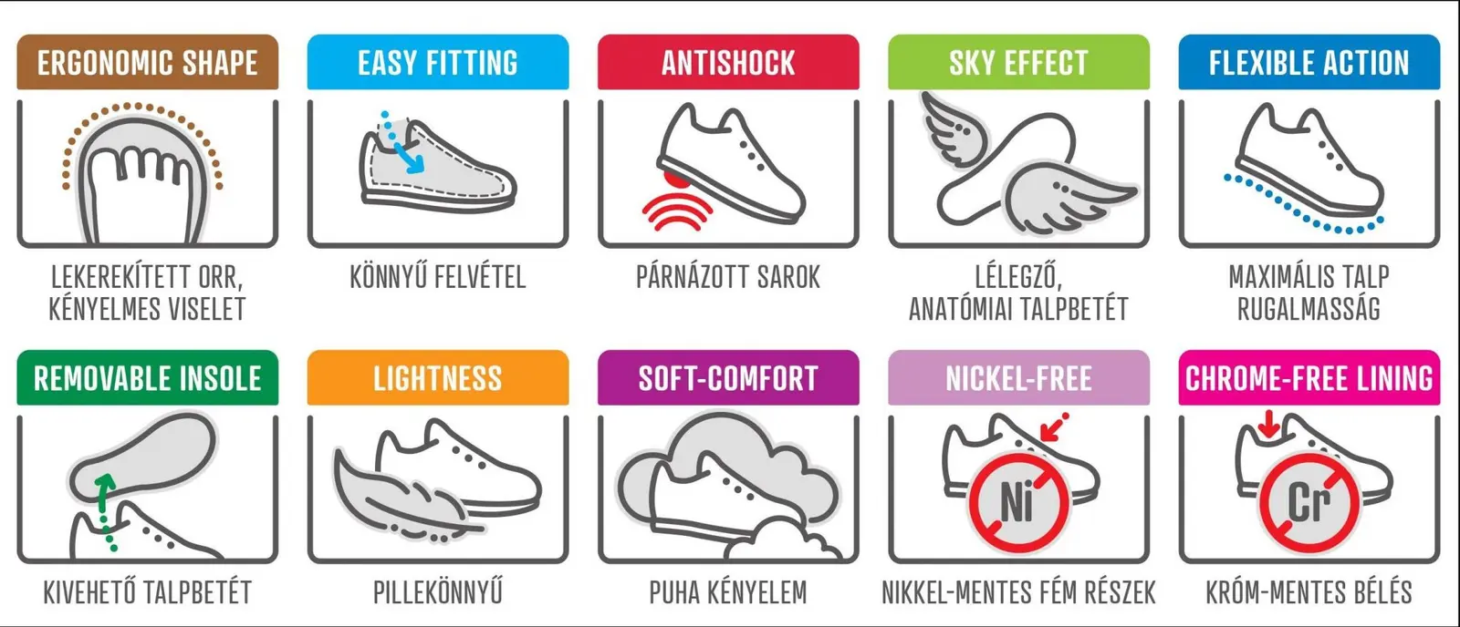 A megerősített sarokrész segíti a boka megfelelő tartását, miközben a rugalmas, könnyű talp természetes mozgást biztosít. A prémium minőségű bőr felsőrész jól szellőzik, felveszi a láb formáját, így hosszabb viselésnél is kényelmes marad.