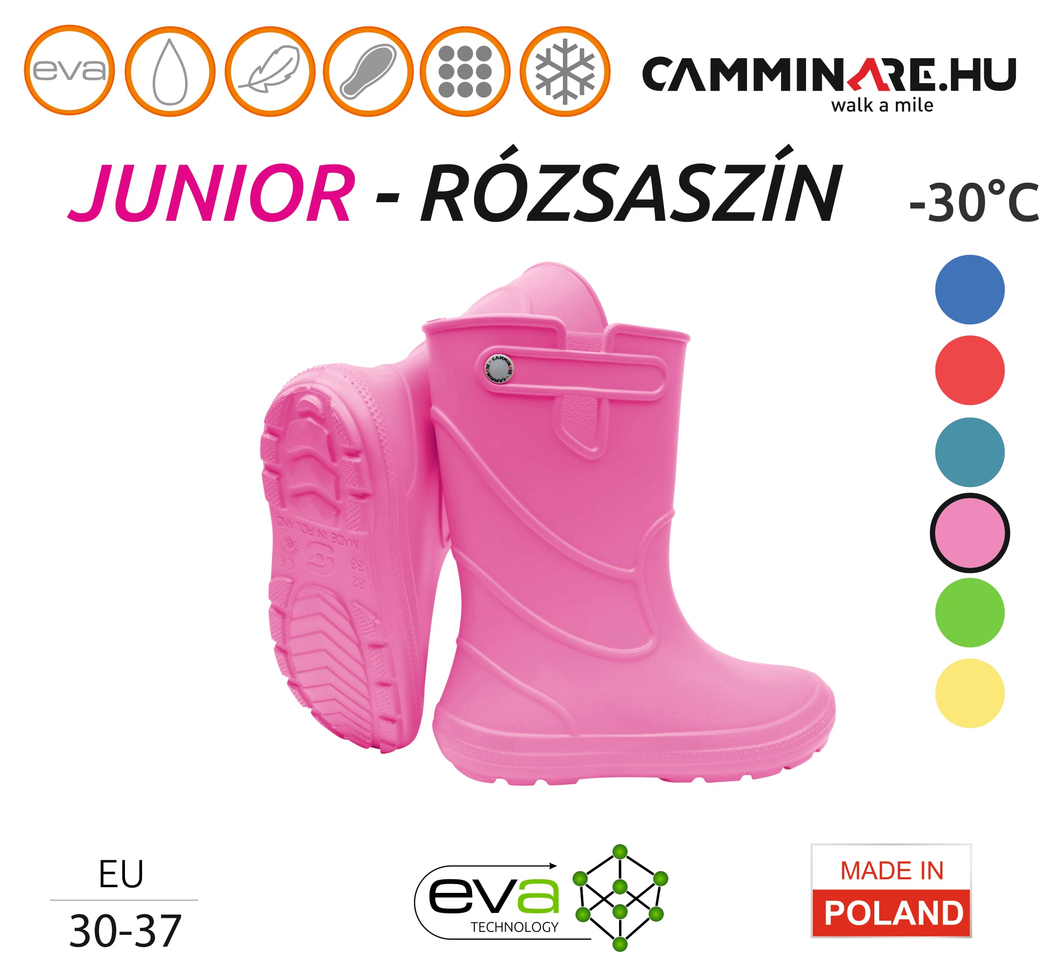 A Camminare gumicsizma könnyű és rugalmas EVA anyagból készült, kivehető béléssel, amely akár -30°C-ig védelmet nyújt. Vízálló, strapabíró és egész évben hordható választás aktív gyerekeknek.