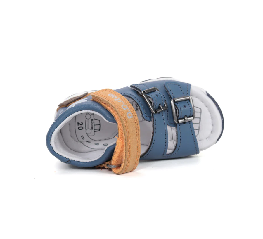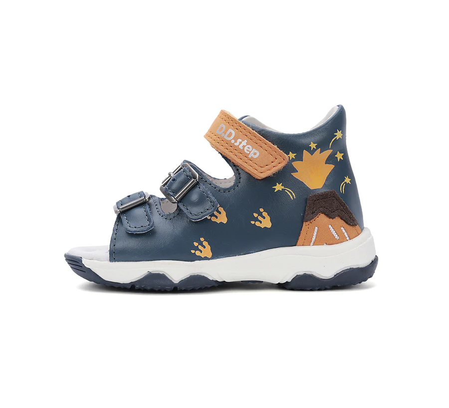 Kék DD Step fiú bőr szandál különleges, fényre színesedő vulkán mintával az oldalán.